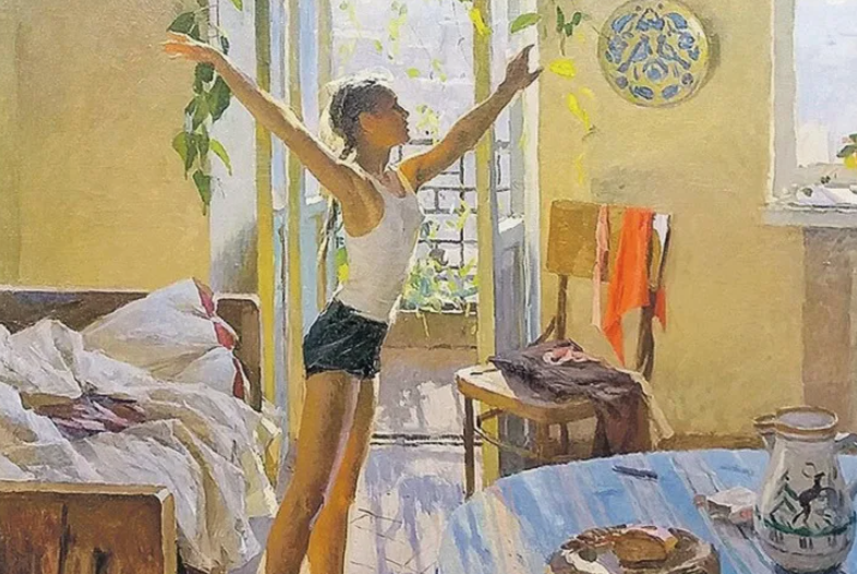 Эту картину многие из вас знают и помнят с детства. Солнечное утро. Юная пионерка только что проснулась и делает гимнастику. В открытые окна врывается свежий ветер, гудят за окном машины, начинается еще один счастливый день советской страны. Так и веет от этой работы ощущением молодости, счастья, свободы! Картина эта называется "Утро". Это не просто какое-то утро, хотя и оно тоже. Это еще утро жизни для подростка на картине. Все впереди! А еще новое утро, новый рассвет всей огромной страны! Картина «Утро» написана в 1954 году. Искусствоведы по праву считают ее аллегорией первых дней хрущевской «оттепели». Да такой, что по ней впору снимать кино! Дело в том, что Татьяна Яблонская изобразила на картине свою старшую дочь Лену. Лене тогда только исполнилось 13 лет. На картине все приметы того времени, а сама квартира, где юная Леночка встречает рассвет своей жизни находилась в центре Киева. Известен даже точный адрес - в доме по улице Красноармейская, 46, где семья художницы жила в 1949–