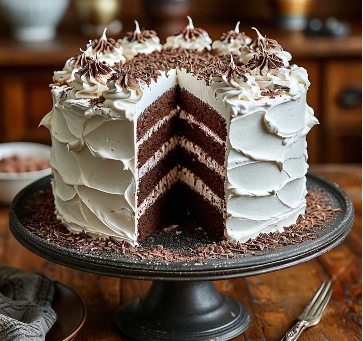 8 яиц, 3, 5 стакана сахара. Для шоколадного теста: 3/4 стакана сахара, 70г сливочного масла, 150г шоколада, 8 белков, 140г муки. Для крема: 6 желтков, 2 стакана сливок, 1 пакетик порошка ванильного сахара, 1, 5 стакана сливок, 300г шоколада, 400г сливочного масла. Приготовить безе: взбить белки в густую пену, всыпать весь сахар и осторожно вымешивать ложкой сверху вниз (тесто разделить на 2 части). Круглую форму смазать маслом, на дно положить вырезанный по форме дна лист бумаги. Смазать маслом, посыпать мукой и из кондитерского мешочка через широкую трубку высадить приготовленное тесто спиралью так, чтобы между рядами был просвет приблизительно в 1 см. Заполненную форму поставить в холодную духовку, сделать самый маленький огонь и печь 45мин-1ч, чтобы тесто хорошо просохло и поднялось. Остальное тесто поставить в холодильник. Готовое тесто выложить бумагой вверх и аккуратно снять бумагу. Если бумага не будет отходить, смочить её холодной водой. Освободившуюся форму охладить так же, ка