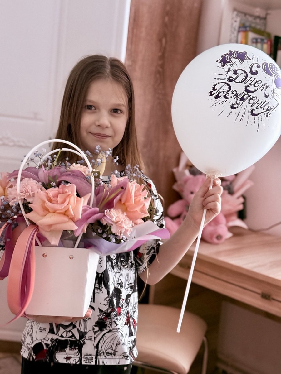 Накануне дня рождения дочки, поздно вечером, я отправилась за 70 километров от дома, чтобы купить ей цветы. Уже ночью я украсила комнату воздушными шариками и букетами. В дополнение к этому я приобрела букет из плюшевых мишек и ещё одного розового мишку среднего размера. Уж очень милые мишки были в том цветочном магазине.