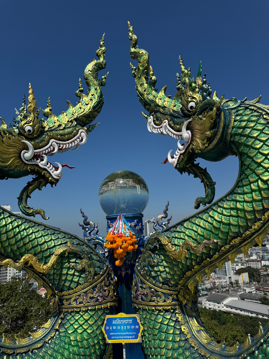 На Востоке дракон считается священным животным. В Таиланде драконы используют не только для украшения храмов, их используют в обрядах, традициях. Драконы защищают храмы, монастыри, дома местных жителей от злых духов. В мифологии могущественное, сильное животное способно вызвать ветер и дождь. А еще драконы способны охранять целый город, который «вверх ногами» отображается в хрустальном шаре. Город Си Рача. Дракон, несомненно, яркое украшение для храма, пагоды и любой площадки. Вот к таким драконам мы отправились. И хорошо, что на машине, потому как смотровая площадка находится высоко на горе. Я бы с большим трудом и долго взбиралась по лесенкам. Мне повезло, подъезная дорога есть. Она извилистая и опасная, ведет к площадке. Есть там небольшая парковка. Территорию совершенствуют, украшают статуями, работают строители. Мы прошли дальше и увидели вдали, со спины, белую, высокую, в полный рост статую Будды, похожую на Леди. В монастырь мы не захотели идти, нам не терпелось посмот