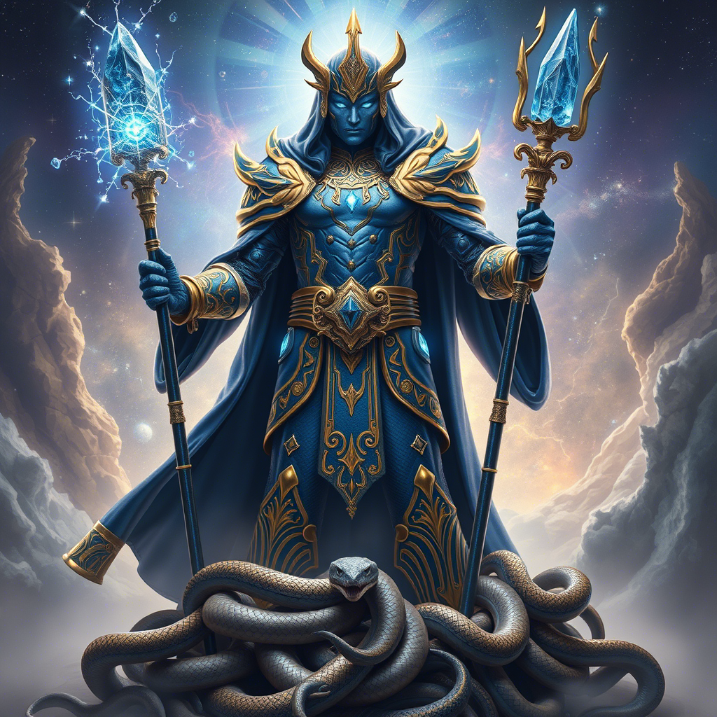 ☁️ В мире, где облака шепчут тайны вселенной, а змеи хранят древние знания, стоит Космос — могущественное существо, чье имя олицетворяет силу и мудрость. Его образ, окруженный светом и клубящимися змеями, стал символом власти над реальностью. Но как он стал тем, кем является сейчас? Позвольте рассказать вам эту захватывающую историю. Космос был рожден в момент слияния стихий — когда гром раскалывал небеса, а море пело свои древние песни. Говорят, что его душа возникла из энергии первого луча солнца, ударившего по водной глади. Его синяя кожа символизирует связь с водой и мудростью, а золотые доспехи подчеркивают его высокий статус. На голове у него сложная корона с рогами, украшенная символами древних времен. Два жезла в его руках — это не просто инструменты магии, но сосуды его силы: их кристаллы излучают голубой свет, способный изменять реальность. 🔮 Однажды Космос услышал призыв облаков, которые шептали ему свои тайны. Эти облака, клубясь вокруг него, вели его к месту, где грани ме