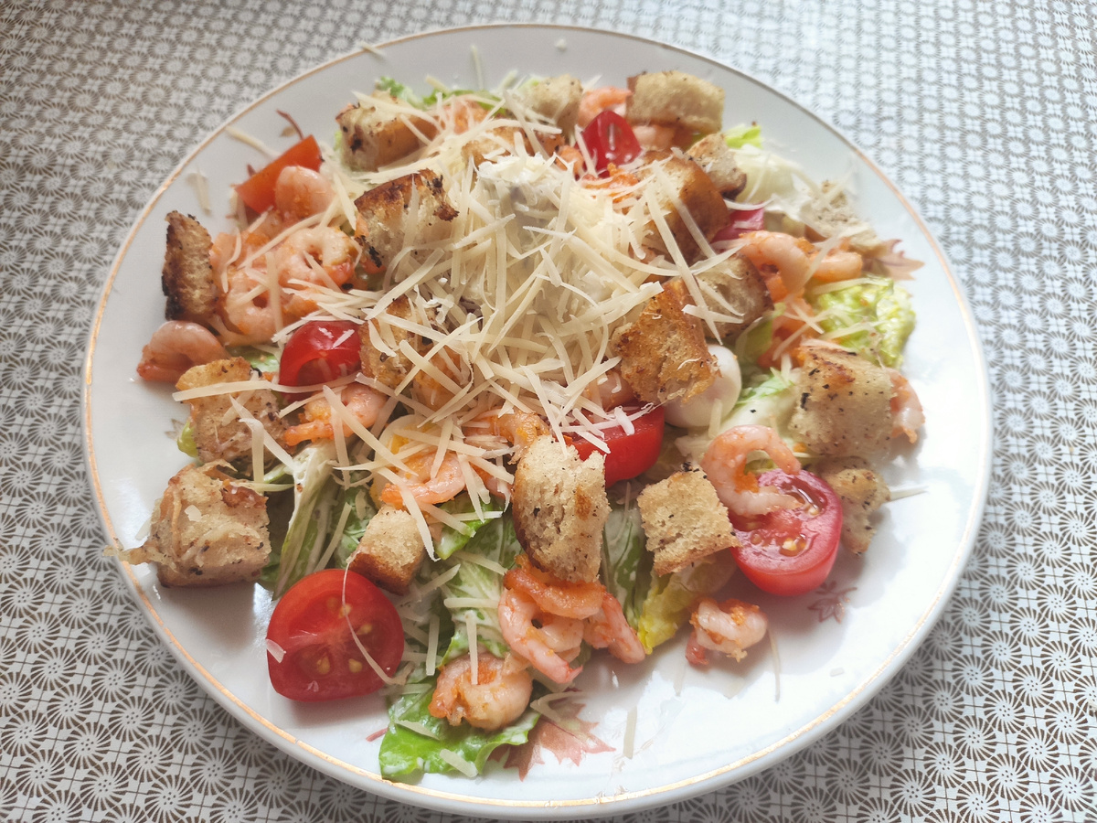 Помню в 90-х на праздниках были исключительно майонезные салаты, и, как правило, из консервов, и картошки. Сейчас, благодаря огромному выбору продуктов можно легко разнообразить праздничный стол новыми блюдами. Если вам приелись оливье и селёдка под шубой - то вы по адресу! Цезарь с креветками Пожалуй, мой любимый салат! Кстати, этот вариант приготовления, так сказать, подогнан под русского потребителя, и не имеет ничего общего с оригинальным, первоначальным рецептом. Скажу сразу, я пробовала класть анчоусы - я их не почувствовала, поэтому больше не использую, как и каперсы. На мой взгляд это перевод денег. Я готовлю Цезарь с салатом айсберг, а не романо, как в оригинальном рецепте. Айсберг больше хрустит. Салатные листья порезать крупно, и смазать соусом: майонез, зерновая сладкая горчица 1 ч.л., 2 зубчика чеснока, тертый на мелкой тёрке пармезан. Листья перемешиваются с соусом, и выкладываются на блюдо. Сверху кладу креветки, обжаренные с чесноком на масле, гренки из белого хлеба