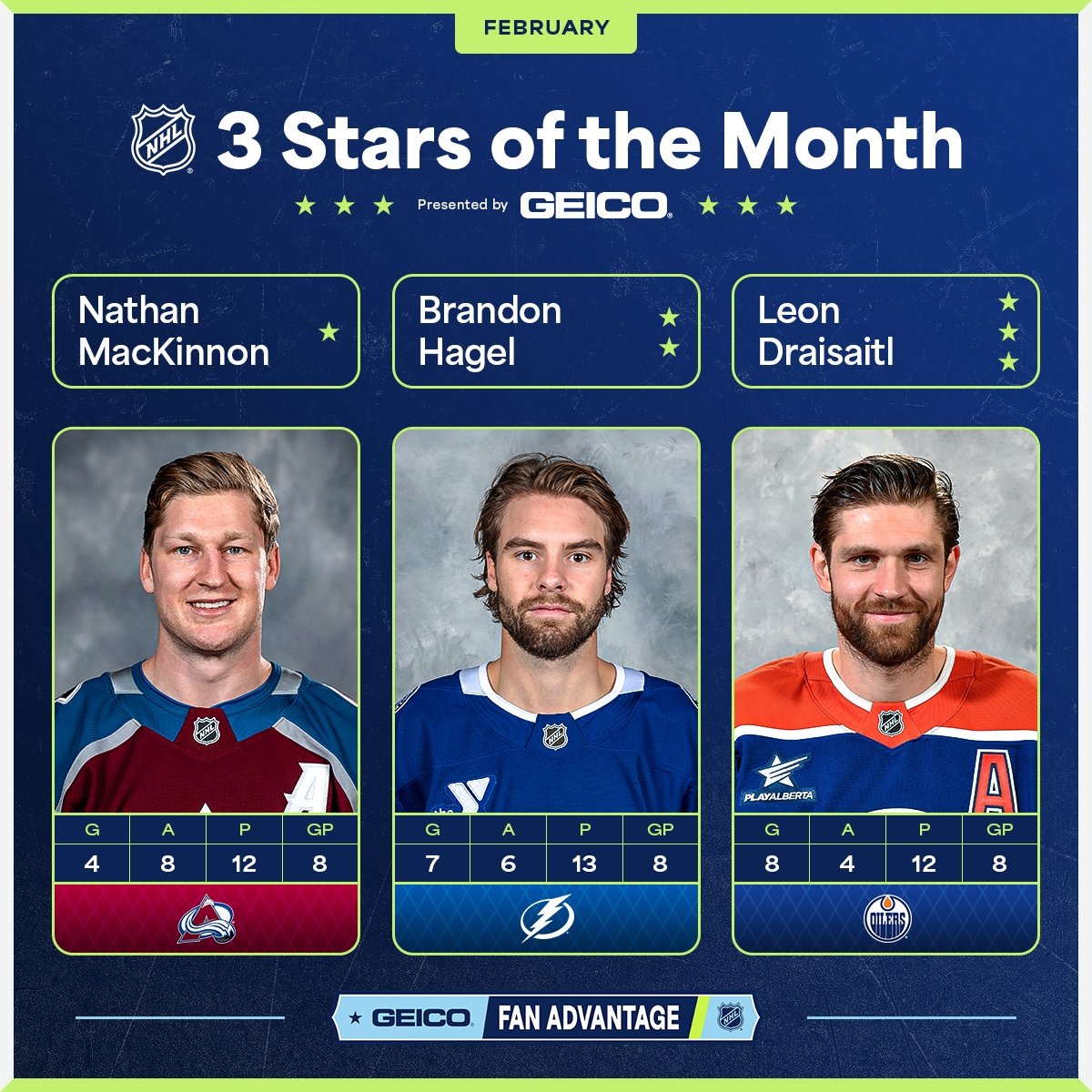 Три звезды февраля: Натан Маккиннон, Брэндон Хейгел и Леон Драйзайтль.