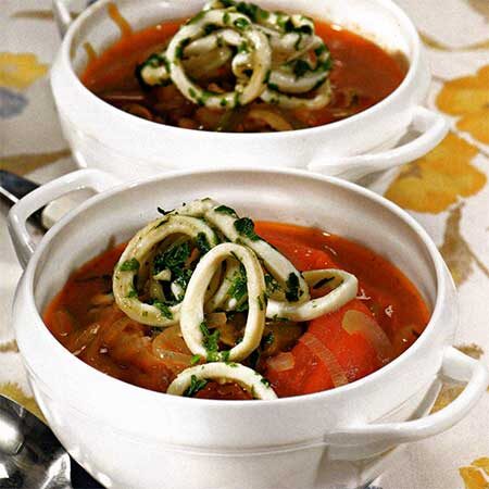 - Разогреть в сковороде оставшееся масло и обжарить кальмаров, помешивая, 3 мин. Разлить суп по тарелкам, разложить кольца кальмаров и посыпать оставшейся петрушкой.