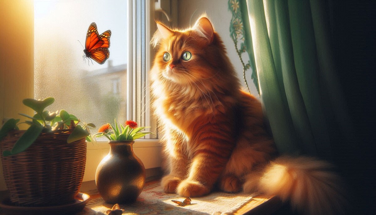 Первый день марта. Солнце, хотя ещё и холодное, начало робко пробиваться сквозь окна, освещая квартиру тёти Клавы. Барсик уютно устроился на подоконнике, где можно было наслаждаться солнечными лучами, грея лапы и слушая шум улицы. Но в этот момент что-то изменилось. Вокруг окна замелькала тень, а затем — мягкий трепет крыльев. Барсик замер. Его взгляд устремился на стекло, где, словно подарок весны, села первая бабочка. Её яркие крылья мерцали на свету, и Барсик, как заворожённый, прижался к стеклу. «Это же птица? Или маленькая летающая игрушка? Надо поймать её!» Кот встал на задние лапы, вытянувшись до предела, чтобы достать бабочку. Его хвост нервно подёргивался, когти царапали стекло, но добыча была недосягаема. Тогда Барсик перешёл к тактике. Он спрыгнул с подоконника, пробежал к кухне, а затем вернулся с разбегу, пытаясь прыгнуть выше. Но его лапы бессильно скользнули по стеклу, и кот приземлился с недовольным “МЯУ!”. Клава, услышав звук, выглянула из другой комнаты. — Барсик, что