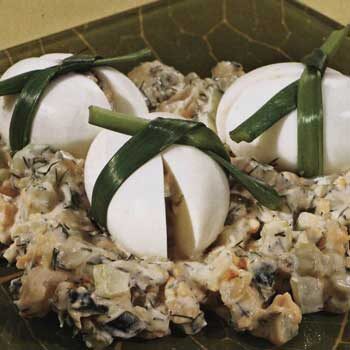- Положить в 4 половинки белков по 1,5 ст. л. салата. Накрыть вторыми половинками. Оставшийся салат разложить по тарелкам. Яйца перевязать перьями зеленого лука и поместить сверху на салат.