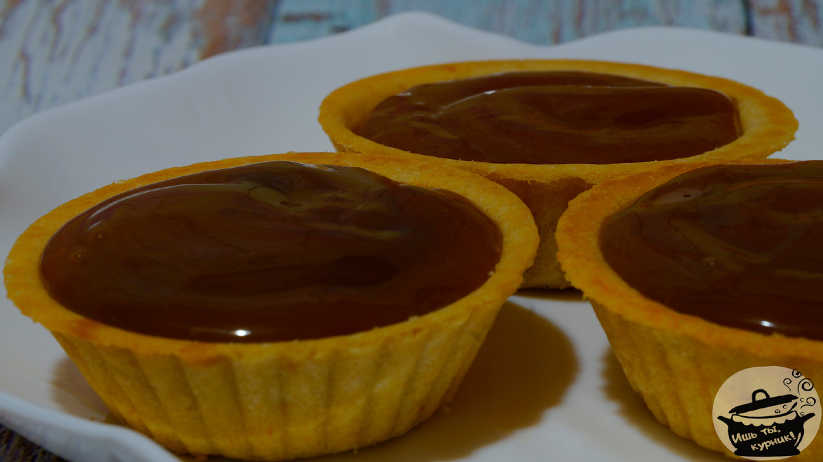 Выложить в тарталетку слой масляного крема затем - ягодного джема и затем карамель.