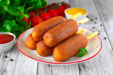 Сосиска в кляре из поленты - это очень вкусно! Корн доги в домашних условиях готовить совсем несложно, быстро и увлекательно. Подавать готовые жареные сосиски в кляре можно с любыми соусами, но чаще всего подают с кетчупом, горчицей или майонезом. Порций: 8 Сосиски: 8 шт. Пшеничная мука: 2 стол.л. Тесто: Пшеничная мука: 100 гр Кукурузная крупа (полента): 100 гр Молоко: 90 мл Сахар: 15 гр Разрыхлитель: 5 гр Сода: 5 гр Паприка: 2 гр Яйца: 1 шт. Фритюр: Растительное масло: 350 мл Общее время приготовления: 30 мин Как сделать корн доги? Сначала подготовьте необходимые ингредиенты по списку. Муку берите высшего сорта. В зависимости от размера яйца муки может понадобится больше или меньше для достижения нужной консистенции. В миске соедините яйцо, поленту, молоко, сахар, разрыхлитель, соду и паприку и перемешайте. Подробнее о том, как работать с разрыхлителем и содой, смотрите в конце рецепта под шагами. Итоговая консистенция должна быть кашеобразной, не густой, но и не жидкой. Оставьте кляр