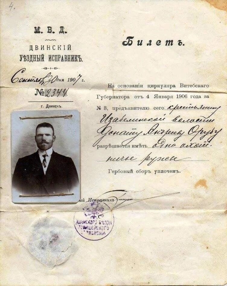 Нищее, бесправное крестьянство Царской России... Маленький, чудом уцелевший, документ 1907 года: разрешение на владение охотничьим ружьём, данное крестьянину Изабелинской волости Витебской губернии Донату Андреевичу Орубу. Обратите внимание на прикреплённое фото крестьянина – ну, прям совсем «нищий и бесправный».