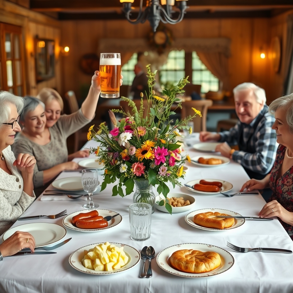 В небольшом городке в сердце Германии, утопающем в зелени холмов и виноградников, каждое воскресенье наступает особенное время для семьи Грюнвальд. В уютном доме, где окна украшены цветными занавесками, стоит большой деревянный стол, который является центром семейных встреч. Это время для общения, обмена историями и укрепления связей между поколениями. Бабушка Анна, хранительница семейных традиций, всегда заботится о том, чтобы стол был накрыт по-особенному. На белоснежной скатерти сверкают серебряные приборы и стоят фарфоровые тарелки, а в центре стола — большая ваза с полевыми цветами. На кухне уже готов ароматный картофельный салат с уксусом и луком, дополняемый традиционными немецкими колбасками, приготовленными по секретному рецепту семьи. Когда все собираются за столом, бабушка Анна начинает трапезу с тоста. Она поднимает бокал пива и произносит: "За здоровье и счастье нашей семьи!". Этот ритуал — не просто формальность, а символ единства и поддержки. Все поднимают бокалы, и в