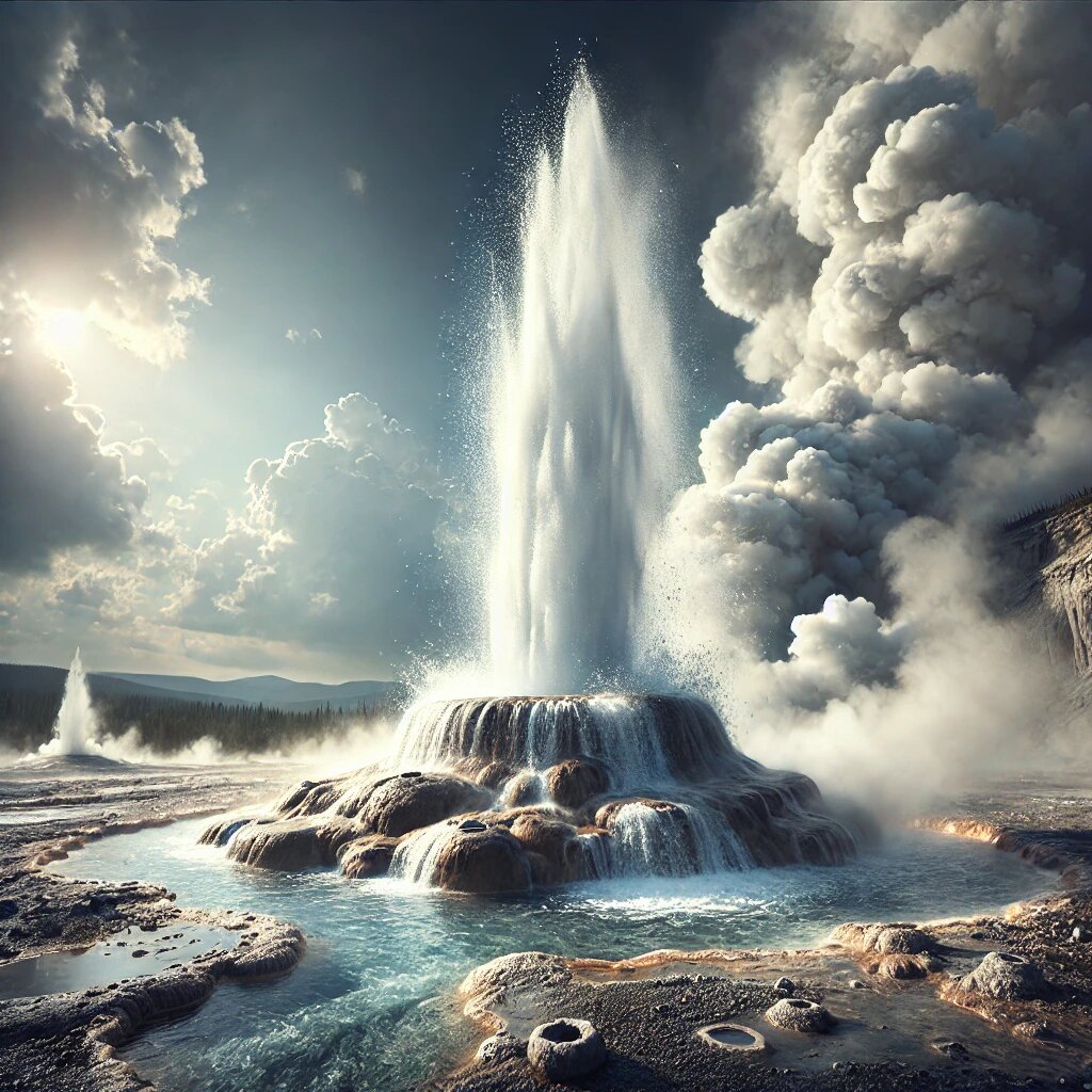 Гейзер – это особый тип горячего источника, который периодически выбрасывает фонтан горячей воды и пара под давлением. Механизм связан с закупорками или сужениями в подземных каналах гейзера. В промежутках между извержениями подземная камера и канал гейзера заполняются горячей водой. Глубоко в канале вода может нагреваться выше точки кипения (состояние перегрева) за счёт геотермального тепла, но не закипает мгновенно из-за высокого давления столба воды. Когда верхние слои воды всё же начинают кипеть или давление внезапно снижается, часть воды в глубине резко вспенивается (превращается в пар). Этот скачкообразный флэш-переход в пар выталкивает весь столб воды вверх в виде фонтанирующего выброса. После извержения гейзер снова наполняется водой, цикл повторяется. Для регулярного действия гейзера необходимы три условия: интенсивный тепловой поток, наличие воды и специфическая геометрия каналов (камера-резервуар и узкие «горлышки», задерживающие выход воды). Неудивительно, что гейзеры встречаются лишь в нескольких местах планеты – обычно в областях поздних стадий вулканизма. Пример – гейзеры Йеллоустоуна (США), где знаменитый «Олд-Фейтфул» (“Старый Служака”) извергается примерно каждые ~65–90 минут благодаря стабильному подпиту магматическим теплом и регулярной водоподаче.