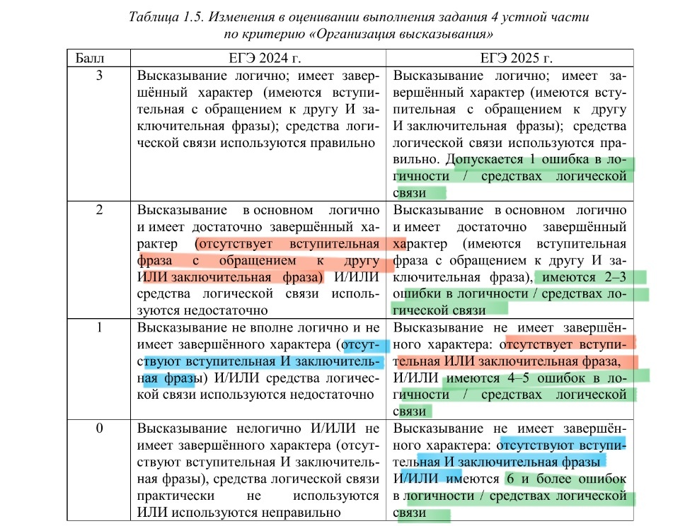Ещё одно уточнение внесено в критерии оценивания выполнения задания 4 устной части, а именно – указано количество допустимых ошибок на каждый балл по критерию «Организация высказывания» - 🟢 в таблице выделено зелёным цветом.