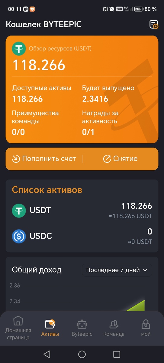 Если конкретизировать, то в программе ByteEpic кнопка Бабло находится внизу ровно посередине. Но давайте по порядку. Кстати, вот мой сегодняшний результат. Плюс 2.3 доллара в копилку. Сегодня после 12 ночи я зашла в программу и сделала то, что делают миллионы людей (в официальном чате ByteEpic) говорят о более 10 млн. Я нажала на кнопку головой робота, сдвинул ползунок с 0 до 100% и нажала на кнопку Создать заказ. После этого в программе активизировались ИИ и пять минут шла торговая сессия в результате чего мои доллары выросли примерно на 2%. 2%в день может это немного для сотни долларов, но если залить 1000 то это будет весомое прибавление к бюджету. Но я пока не буду делать резких движений. Это мой телеграм, отвечу на ваши вопросы https://@amelinatatyana А это моя реферальная ссылка в ByteEpic