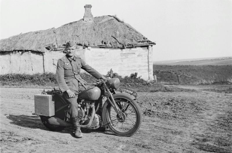 Работа немецкого фотокореспондента Франца Грассера в советском селе Белгородской области. Военнослужащий вермахта из состава 167-й пехотной дивизии позирует на мотоцикле NSU TYP251-OS. Немец несмотря на молодость довольно матерый вояка. На кармане знак «за ранение» в бронзе и «за штурмовые атаки».Над карманом ленты Железного креста и «мороженного мяся»(жаргонное название награды за зимнюю кампанию 41-42г. на Вост. фронте). Август 1943г. #история #война #немцы