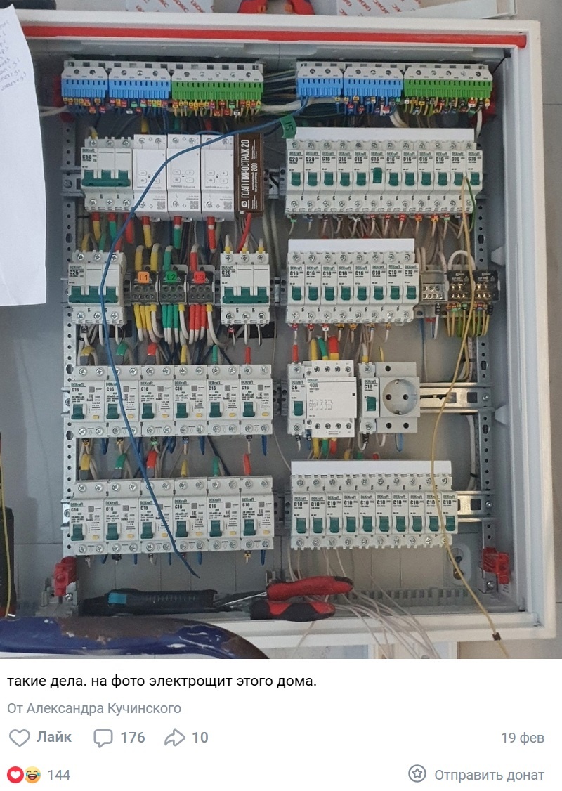 В Интернете часто публикуют информацию о распределительных устройствах, конечные цепи освещения в которых не защищены устройствами дифференциального тока с номинальным отключающим дифференциальным током до 30 мА. Например, в сообществе Я – ЭЛЕКТРИК Александр Кучинский представил щиток для дома: Александр Кучинский не опубликовал схему щитка и пояснения к ней. Поэтому нельзя точно указать все ошибки, допущенные при проектировании и сборке щитка. Можно предположить, что конечные цепи освещения в щитке не защищены УДТ с номинальным отключающим дифференциальным током до 30 мА. Это предположение подтверждает следующая дискуссия: Объяснение Александра Кучинского «узо по бюджету не проходит к сожалению» не выдерживает критики. Представленный им щиток можно было выполнить так, чтобы были выполнены все требования при том же «бюджете». В частности, следовало выполнить требование п. 411.3.4 ГОСТ Р 50571.4.41: О стандарте см. статью Новый ГОСТ Р 50571.4.41–2022: защита от поражения электрическим