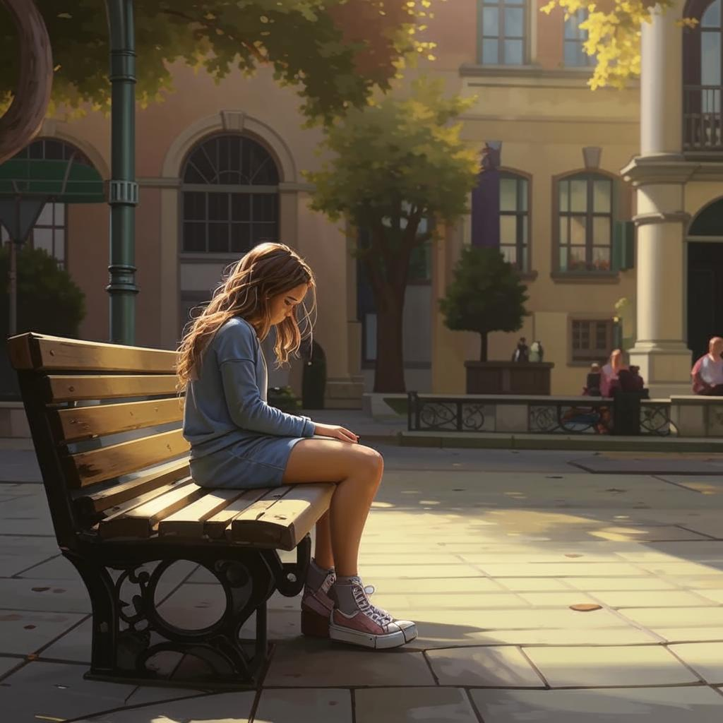 Она сидела на скамейке, немного в стороне от всеобщего веселья, словно зритель, наблюдающий за спектаклем, в котором не могла принять участие. Её бледное лицо, обрамленное темными волосами, казалось, светилось в полуденном солнце, но это был скорее болезненный, нездоровый свет. Казалось, солнечные лучи, такие живительные для остальных, могли разрушить её хрупкую красоту, как тонкий фарфор.