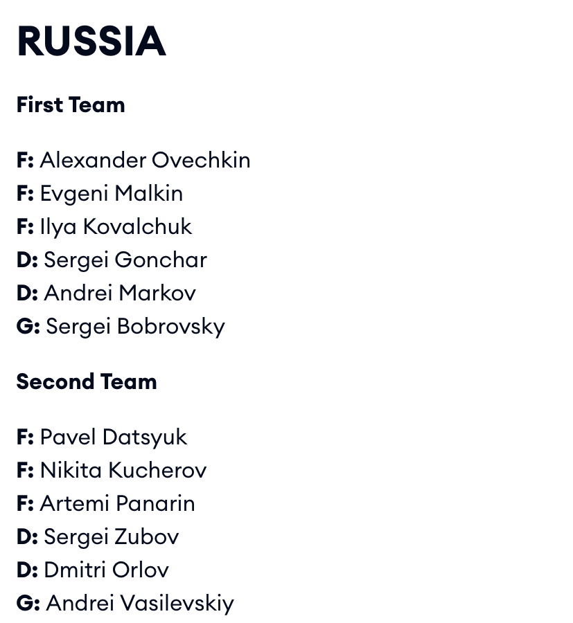 По случаю того, что НХЛ огласила лучшие составы за последнюю четверть века каждой из 30 команд, игравших с 2000 года, я решил совершить аналогичное действие по странам – собрать первую и вторую сборные. Выбор не ограничивается игроками лиги, хотя фактор выступления в ней добавлял хоккеисту веса. Важнейшее значение имеет статистика в международных матчах. Россияне не играли в турнирах под эгидой ИИХФ уже более трёх лет, но российские хоккеисты продолжают выступать в НХЛ и других лигах. В отличие от многих других сборных, по которым я выполняю это действие, проблема с подбором лучшего состава за прошедшие 25 лет для России заключается в наличии огромного количества легендарных игроков. Если мы посмотрим на список россиян, показавших лучшие статистические результаты в НХЛ с начала тысячелетия, то в нём будут фигурировать именно эти парни, и трудно придумать причину, чтобы поставить под сомнение включение любого из них. С учётом международных результатов, Ковальчук переходит из второй кома