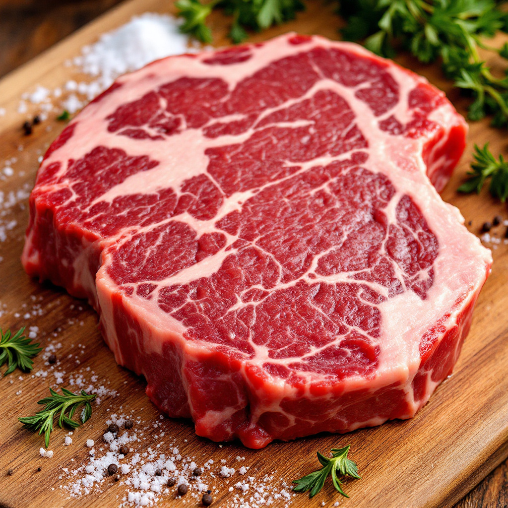 Приготовление стейка из мраморного мяса требует некоторого внимания к деталям, чтобы достичь идеального вкуса и текстуры. Вот как правильно выбрать и приготовить мраморный стейк: Как выбрать мраморное мясо 1. **Посмотрите на мраморность**: Мраморное мясо содержит распределенные жировые прожилки, которые делают его более сочным и мягким. Ищите мясо с равномерным мраморным рисунком. Чем больше мраморность, тем лучше. 2. **Выбор отрубов**: Наиболее популярные отрубы мраморного мяса: - **Рибай (Ribeye)**: Очень сочный и мраморный, подходит для жарки. - **Т-бон (T-bone)**: Сочетает в себе два разных куска мяса (филе и короткую поясницу). - **Стейк Нью-Йорк (New York Strip)**: Мясной вкус с хорошей мраморностью. - **Филе миньон**: Самый нежный отруб, менее мраморный, но очень мягкий. 3. **Обратите внимание на цвет**: Мясо должно иметь яркий, насыщенный цвет, без признаков потемнения или неестественных оттенков. 4. **Аромат**: Мясо должно иметь свежий, не резкий запах. Если у мя