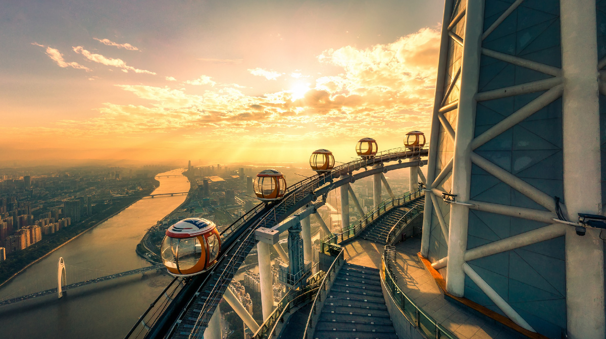 Колесо обозрения на телебашне Кантона в Гуанчжоу является самым высоким в мире и состоит из 16 «хрустальных» смотровых сферических кабин или называемых также "Пузыристый трамвай" (Bubble Tram), которые совершают оборот примерно за 20 минут по дорожке эллиптической формы, проходящей по краю крыши башни. Каждый такой "трамвайчик" диаметром 3,2 метра вмещает 4-6 пассажиров и движется по наклонной дорожке. Туристы могут наслаждаться видом Гуанчжоу со всех сторон в течении примерно 20 минут. Создатели аттракциона не забыли о безопасности. Инженеры гарантируют, что башня выдержит землетрясение магнитудой 8 баллов и тайфун силой 12 баллов. Основная часть телебашни Кантона имеет высоту 454 метра, высота антенной мачты — 146 метров, а общая высота составляет 600 метров. Таким образом это самая высокая башня в Китае. На телебашне находится еще несколько интересных объектов. Вот некоторые из них. На высоте 168–334 метра на башне Гуанчжоу находится «Дорожка Человека-паука», которая является само