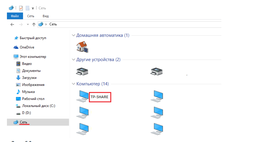 - Найдите имя файлового сервера (по умолчанию это TP-SHARE) и дважды щёлкните по нему для доступа к файлам.