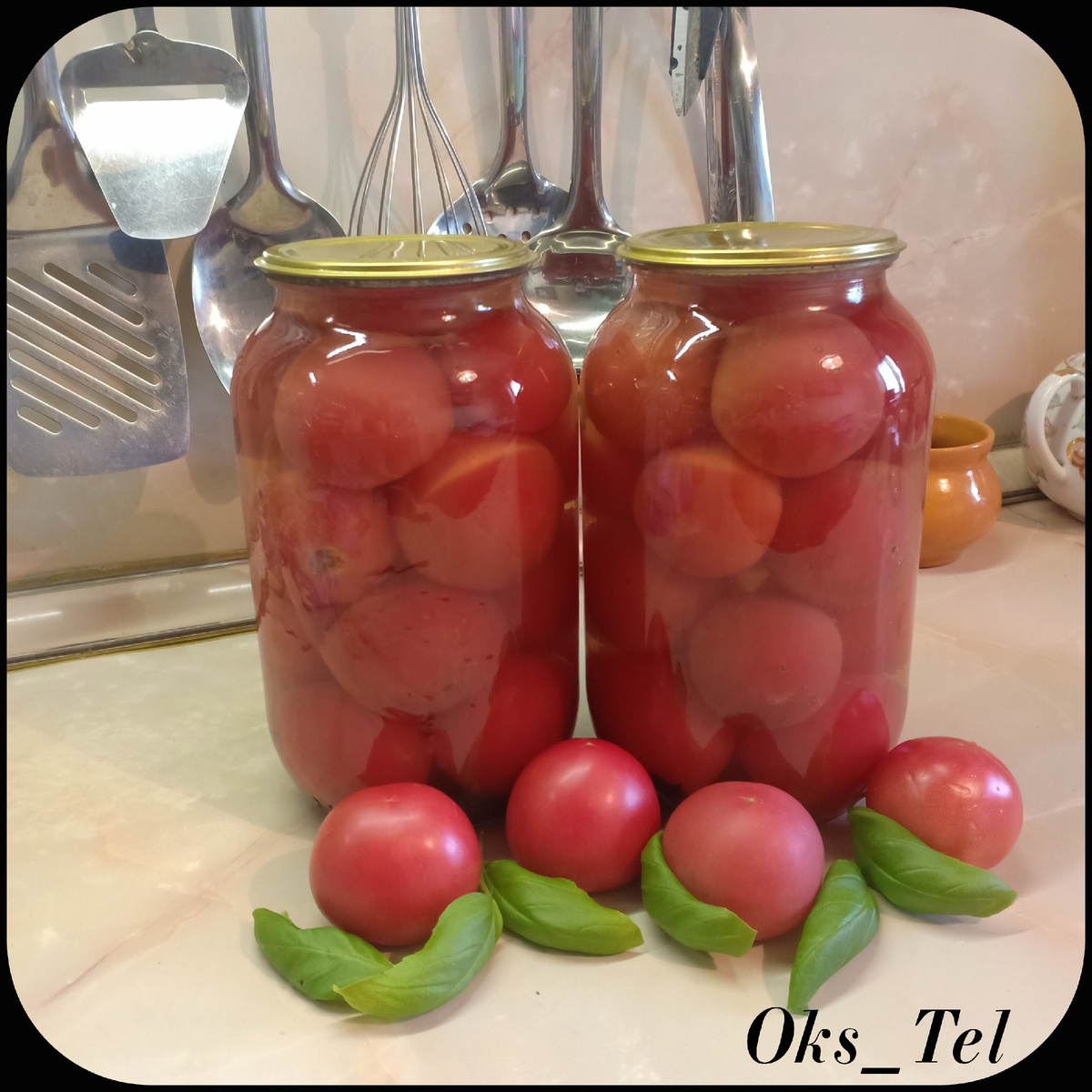 Изумительный рецепт консервированных помидор. В меру сладенькие с очень приятным медовым послевкусием и легким привкусом базилика никого не оставят равнодушными. Понадобится на 3л банку: - 1,6 - 1,8кг помидоров, - веточка базилика, - 100г меда, - 2ст.л. сахара, - 1,5ст.л. соли (с горкой), - 1ст.л. уксусной эссенции 70%, - 1,5л воды. Приготовление: 1. Помидоры хорошо помыть, наколоть зубочистокй в области плодоножки и обсушить. 2. На дно заранее простерилизованной банки положить веточку базилика, уложить помидоры, залить кипятком и выдержать 15мин, накрыв крышкой. 3. Затем воду слить в кастрюлю, добавить в нее мед, соль и сахар. Рассол вскипятить, и в конце влить в него уксусную эссенцию. 4. Горячим рассолом залить помидоры, накрыть банки заранее простерилизованными крышками и закатать. 5. Банки с помидорами перевернуть вверх дном, укутать и оставить до полного остывания. Приятного аппетита!
