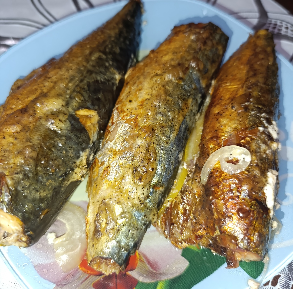 Ингредиенты: скумбрия - 4 шт лук - 1 шт лимон - 1/3 шт перец - 0,5 ч л соль - 0,25 ч л майонез - 1 ст л Лук нарезаем полукольцами и выкладываем на фольгу. Фольгу я выкладываю крест на крест, чтобы сделать "место" для рыбки. Майонез смешиваем с перцем и солью. Лимон нарезаем полудольками. Рыбку очищаем от головы, плавников, внутренностей. Обмазываем смесью майонеза и в пузико выкладываем нарезанный полудольками лимон. Выкладываем рыбку на подушку из лука. Сворачиваем фольгу, чтобы у рыбки было "место". Смотрим, чтобы фольга закрыла хвостики Ставим в духовку на 45 минут при температуре 165 градусов. Достаем нашу рыбку. Приятного аппетита!!!!!