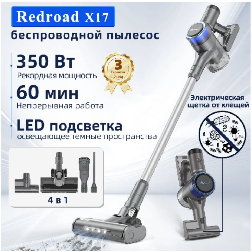 Redroad X17 — это пылесос, который вас приятно удивит! С мощностью 350 Вт и силой всасывания 25 кПа, он легко справляется с любыми загрязнениями, от шерсти домашних животных до мелких крошек и пыли. Но это еще не всё! Потрясающая мощность и длительная работа С аккумулятором на 2000 мАч, Redroad X17 работает до 60 минут в экономичном режиме, что на 20% дольше, чем у большинства пылесосов в этом сегменте. Вам не нужно будет останавливать уборку для подзарядки — пылесос легко справляется с уборкой всего дома за один подход. Сила всасывания на высшем уровне С мощностью 350 Вт и силой всасывания 25 кПа Redroad X17 удаляет загрязнения с любых поверхностей. В сравнении с конкурентами в этом ценовом сегменте, его мощность на 15% выше, что позволяет собирать больше пыли и мусора за меньшее время. Многоуровневая фильтрация для чистоты воздуха Система фильтрации с эффективностью до 99,99% помогает не только собирать пыль, но и очищать воздух в вашем доме. Это особенно важно для аллергиков и людей