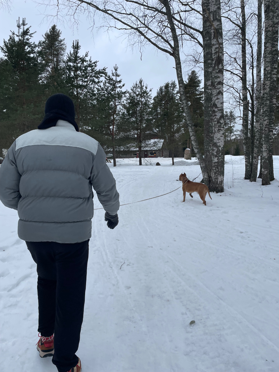 Потом брат сказал, что пора выгуливать собаку. Мы втроем оделись и пошли гулять.