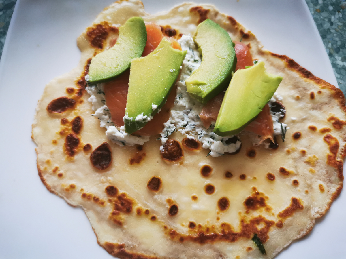 Блинчики могут быть разные, но вкуснее их есть с разными начинками. Предлагаю две начинки: соленую и сладкую. Для соленой начинки берём творог, укроп, слабосоленую красную рыбу и авокадо. Творог смешиваем с укропом и немного солим, намазываем на половину блина, кладём кусочки рыбы, а сверху авокадо. Накрываем второй половиной, и сворачиваем ещё раз пополам. Получается вот такой конвертик. Мне понравился именно такой способ свертывания, получается удобно есть прямо руками и ничего особо не выпадает. Сладкая начинка у меня тоже с творогом, но теперь уже с сахаром, а сверху кладём хурму. Я хотела, чтобы хурма была свежей, но мне попалась сильно вяжущая, поэтому я решила обжарить её в сахарном сиропе. К паре ложек сахара добавляем ложку воды, растапливаем сахар на сковороде и добавляем немного сливочного масла. Обжариваем небольшие кусочки хурмы в этом сиропе. Дальше схема такая же. Кладём на половину блинчика творог, сверху хурму и делаем конвертик. На самом деле эти начинки можно