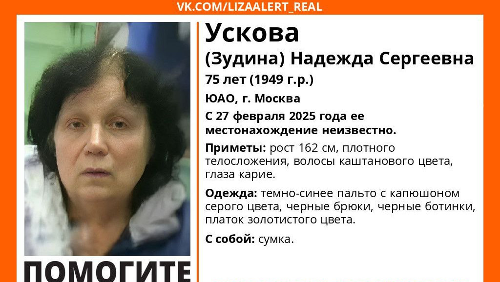 Волонтеры поискового отряда "ЛизаАлерт. Тверская область" разыскивают пропавшую Надежду Сергеевну Ускову (Зудину). Женщина пропала в Южном административном округе Москвы, местонахождение женщины неизвестно с 27 февраля. Пенсионерка может находиться в Тверской области.