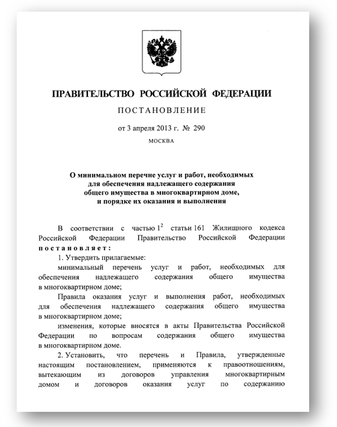 - Постановление Правительства от 03.04.2013 № 290 — содержит перечень услуг для содержания общего имущества