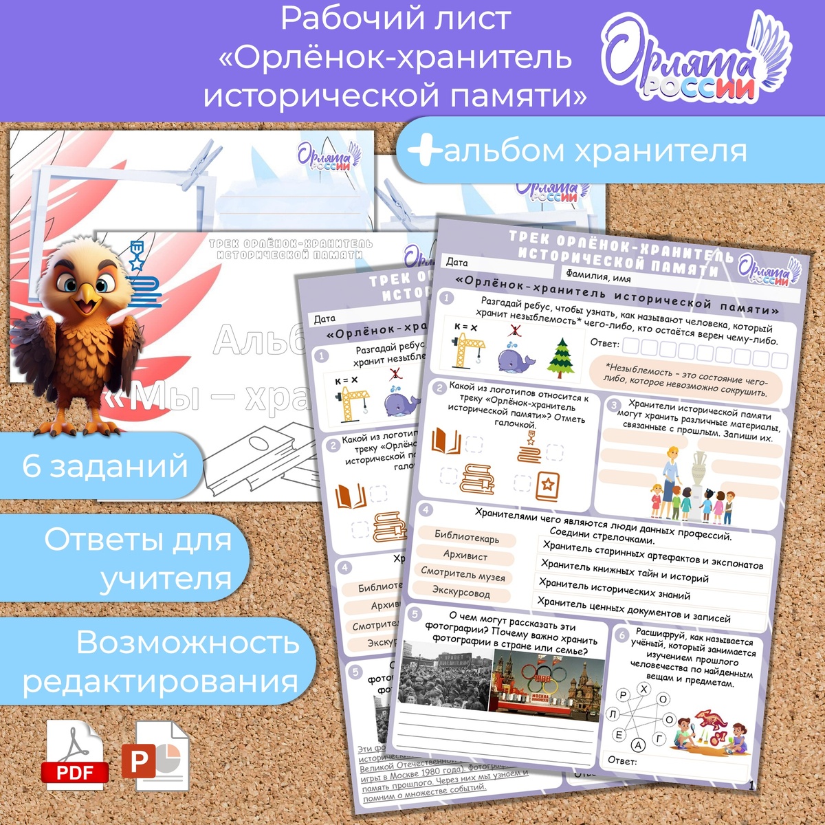 Рабочий лист «Орленок-хранитель исторической памяти». Трек «Орленок-хранитель исторической памяти» для внеурочной деятельности «Орлята России». Рабочие листы включают в себя 6 разноплановых заданий плюс альбом "Мы - хранители" на отдельном листе и ответы на задания для учителя. Содержание: 1. Разгадай ребус, чтобы узнать, как называют человека, который хранит незыблемость чего-либо, кто остаётся верен чему-либо. 2. Какой из логотипов относится к треку «Орлёнок-хранитель исторической памяти»? Отметь галочкой. 3. Хранители исторической памяти могут хранить различные материалы, связанные с прошлым. Запиши их. 4. Хранителями чего являются люди данных профессий. Соедини стрелочками. 5. О чем могут рассказать эти фотографии? Почему важно хранить фотографии в стране или семье? 6. Расшифруй, как называется учёный, который занимается изучением прошлого человечества по найденным вещам и предметам. Файл в формате PDF и PPTX. Есть возможность редактирования. Подходит для цветной и черно-белой печа