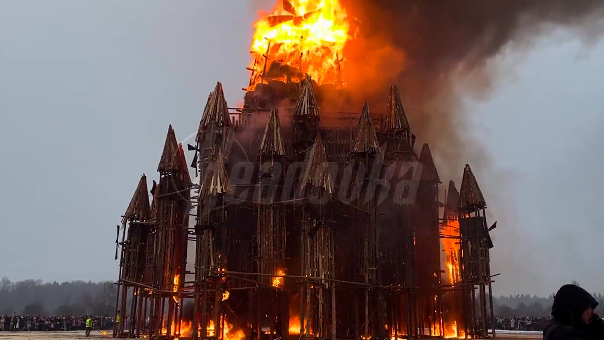 В арт-парке Никола-Ленивец на Масленицу сожгли 26-метровую мельницу
