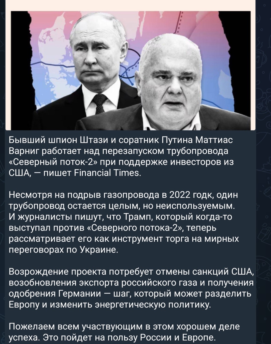 Сейчас гуляет много разной информации о судьбе газопроводов "Северный поток". Часто пишут, что их хотят запустить по новой. По одной версии, некий американский предприниматель покупает права на эту трубу. По другой версии, действует некий "друг Путина" из бывшей спецслужбы ГДР "Штази", который пытается урегулировать вопрос с запуском СП.