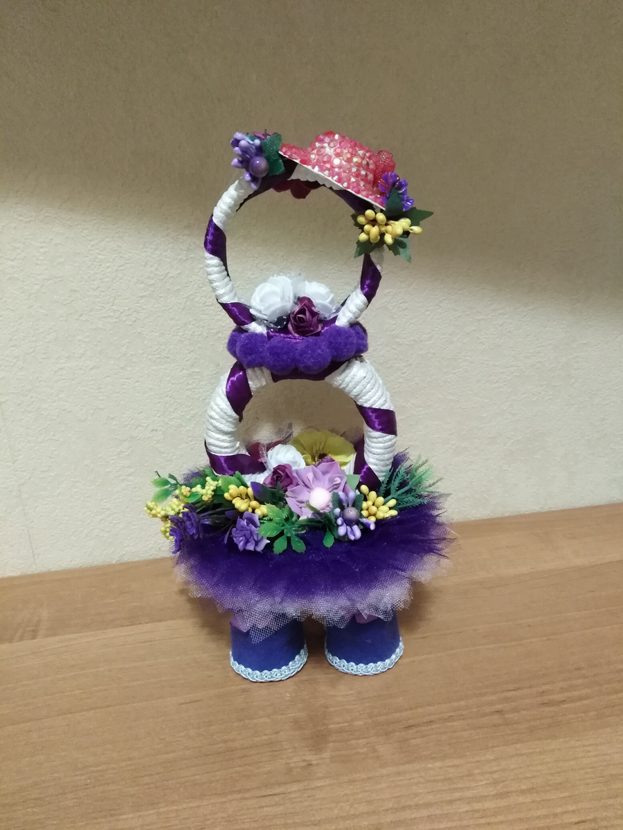 Для нижней части взяла гофрокартон, обклеила его салфетками, после высыхания обклеила фунтиками из фатина белого и сиреневого (пурпурного), прикрепила ножки в башмаках снизу и восьмёрочку - сверху. Стык двух колец задекорила помпонами и декоративными цветами.