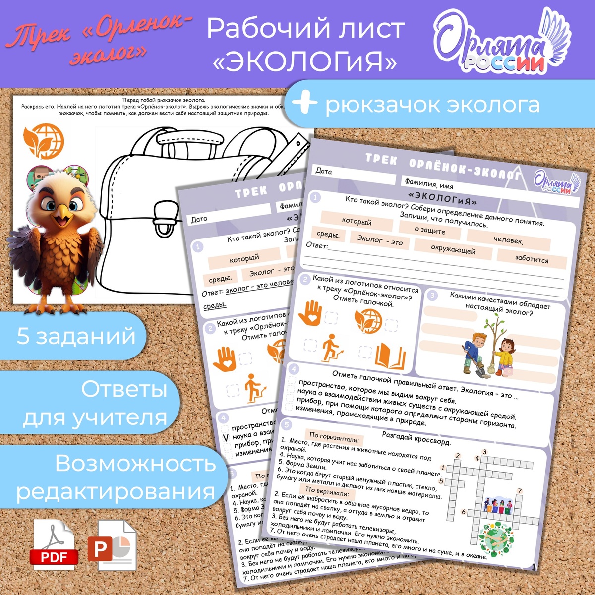 Рабочий лист «ЭКОЛОГиЯ». Трек «Орленок-эколог» для внеурочной деятельности «Орлята России». Рабочие листы включают в себя 5 разноплановых заданий плюс 6 задание на отдельных листах и ответы на задания для учителя. Содержание: 1. Кто такой эколог? Собери определение данного понятия. Запиши, что получилось. 2. Какой из логотипов относится к треку «Орлёнок-эколог»? Отметь галочкой. 3. Какими качествами обладает настоящий эколог? 4. Отметь галочкой правильный ответ. Экология – это … 5. Разгадай кроссворд. 6. Перед тобой рюкзачок эколога. Раскрась его. Наклей на него логотип трека «Орлёнок-эколог». Вырежь экологические значки и обклей ими рюкзачок, чтобы помнить, как должен вести себя настоящий защитник природы. Файл в формате PDF и PPTX. Есть возможность редактирования. Подходит для черно-белой печати. #орлятароссии #внеурочнаядеятельность #начальныеклассы #материалыдляучителей #рабочийлист #уроки #образование