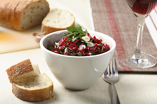 Интересный салат на любителя получится из свеклы и крабовых палочек. Это довольно сытное и вкусное блюдо, которое не вредит фигуре — всего 134 ккал на 100 г. Для приготовления возьмите:
