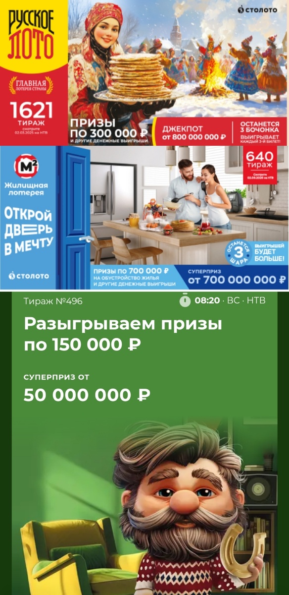 Что я выиграл в лотереи 02.03.25. Русское лото, Жилищная лотерея, Золотая подкова, Мечталлион.