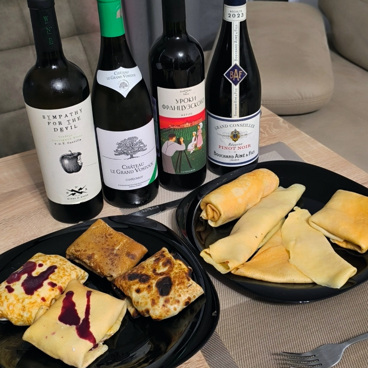 Итак, мы выбрали 4 разных, как мне казалось, базовых вина, подобрав их к конкретным начинкам. Однако решили попробовать всё со всем и вот, что из этого вышло.