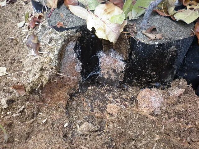 Да, контейнеры с саженцами мы выставляем на опилочную мульчу, и с боков и сверху, тоже присыпаем опилками. В опилки прорастает мицелий грибов. И корни растений растут в такой опилочный субстрат, пронизанный мицелием грибов. Например, так выглядят корни, которые проросли в дренажные отверстия.