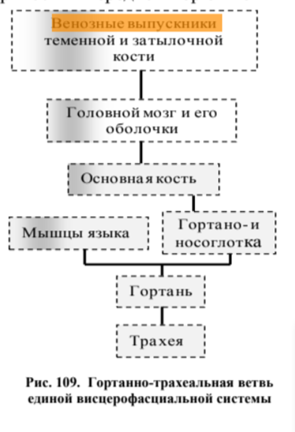 На рис. 109 *1* схема, которая дает представление о картине поражения при гортано-глоточном спазме. Состояние, характерное для «каски невротика», нарушает функции венозных выпускников теменных и затылочной костей. Патология распространяется на ТМО, на клиновидную (основную) кость, мышцы языка, гортань, трахею. Через трахею патология затрагивает и функцию легких. Функция легких связана с сердцем и кровообращением.