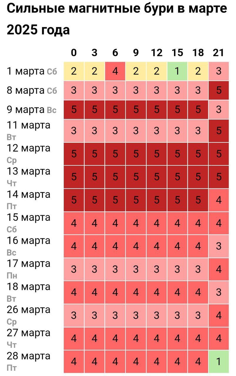 Москва, 2 марта 2025 года. Россия готовится к настоящему солнечному испытанию: с пятницы, 7 марта, страну накроют мощнейшие магнитные бури, вызванные пиком солнечной активности. По данным Лаборатории солнечной астрономии Института космических исследований РАН, геомагнитные возмущения начнутся в конце недели и продлятся до конца месяца с разной интенсивностью. Эксперты предупреждают: март станет одним из самых неспокойных месяцев 25-го солнечного цикла, который достиг своего максимума. Согласно прогнозу, первая волна бурь ожидается 7–9 марта с силой до 5 баллов по индексу Kp, что классифицируется как буря уровня G1. Затем, 14–15 марта, удар усилится до 6 баллов (G2), обещая самые мощные геоудары в этом месяце. После короткого затишья возмущения вернутся 20–22 марта и будут продолжаться с перерывами до 31 числа. Причиной станет серия солнечных вспышек класса M и X, зафиксированных в последние дни февраля, и выбросы корональной массы, которые уже движутся к Земле. «Мы наблюдаем необычно