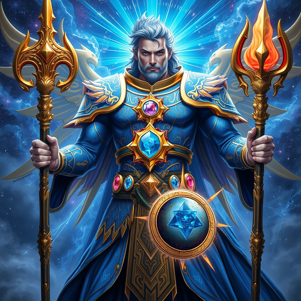 🌌 В мире, где время течет по разным законам, а магия таится в каждом луче света, стоит Космос — могущественный персонаж, чье имя стало легендой среди тех, кто верит в силу древних знаний. Его образ, окруженный сиянием и жезлами власти, олицетворяет собой связь между прошлым, настоящим и будущим. Но как он стал тем, кем является сейчас? Позвольте рассказать вам эту захватывающую историю. Космос был рожден на границе миров, где небо встречается с морем, а земля погружается в вечные глубины. Говорят, что его душа возникла из слияния голубого пламени времени и золотой энергии пространства. Его синие доспехи символизируют спокойствие и мудрость, а золотые акценты подчеркивают его власть над реальностью. Драгоценные камни на груди и поясе хранят древние заклинания, способные изменить судьбу целых миров. Два его жезла — это не просто инструменты магии, но ключи к величайшим тайнам вселенной: один увенчан трезубцем с пламенем, символизирующим силу, другой украшен сложными золотыми узорами, во