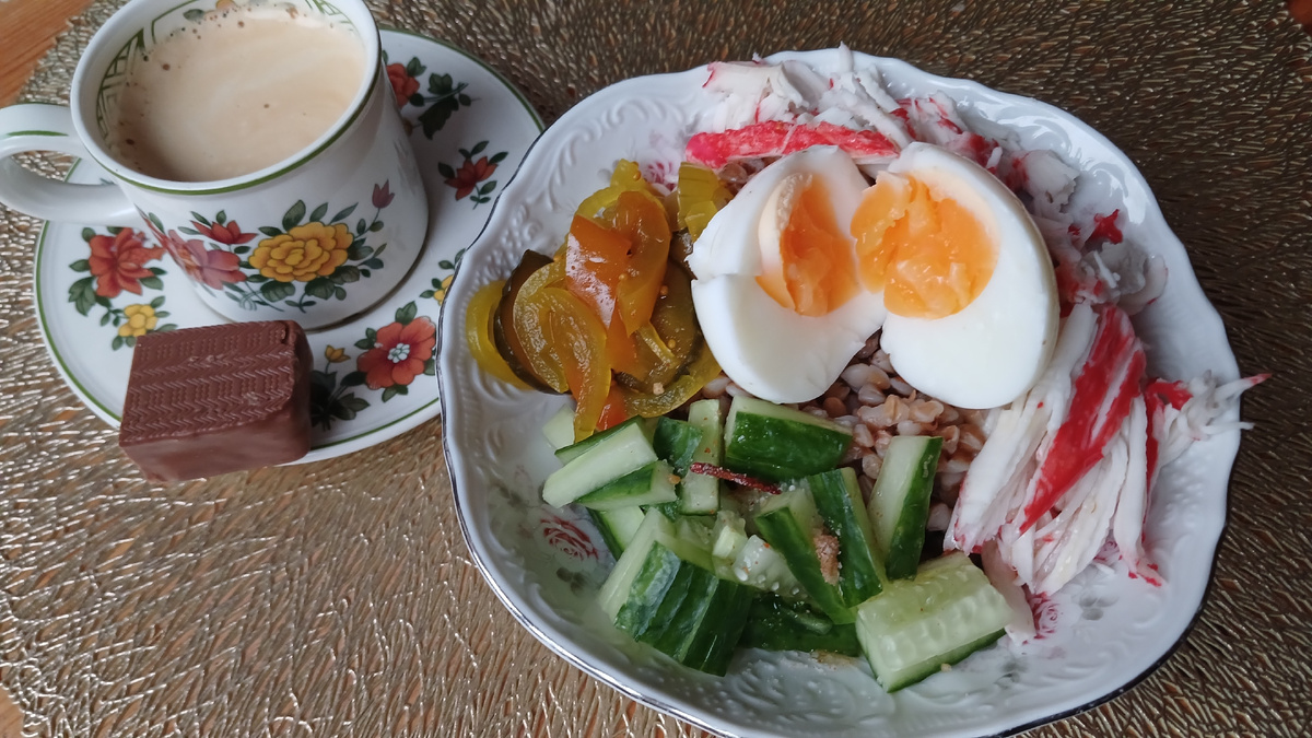 Очень сытный и яркий завтрак сегодня - боул. В основе - гречка (варила вчера на ужин побольше, чтобы и на завтрак хватило), к ней - яйцо, снежный краб, огурчики как в маке, огурцы свежие, кунжутное масло, адыгейская соль И чашка эспрессо со сникерсом. Обед сборный из того, что нашлось в холодильнике: кофе, бутерброды с печеночным паштетом, батончик мюсли, мандарин, сыр и плюс уха из горбуши Ездили с сыном по его делам, поэтому был по факту не обед, а обедоужин. Я потом уже не ела ничего. А муж с сыном доели гречку и сосиски. Меню год назад