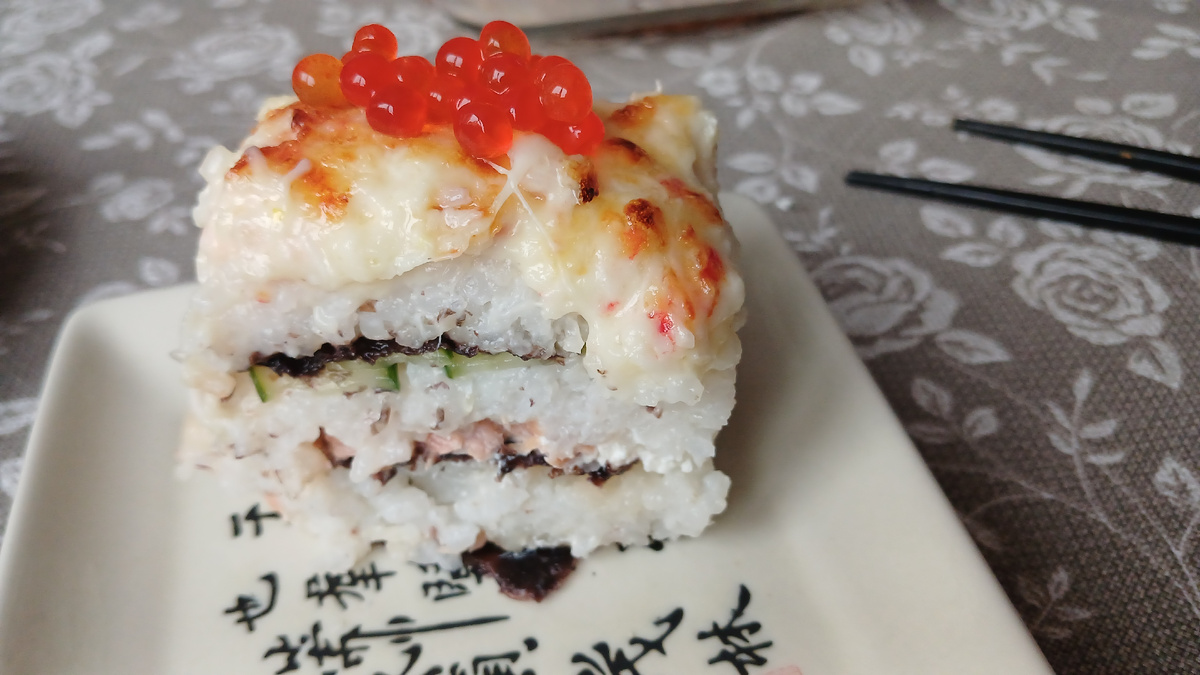А вот в этом рецепте есть разные варианты сырной шапочки для роллов и суши-торта и суши-торт без запекания