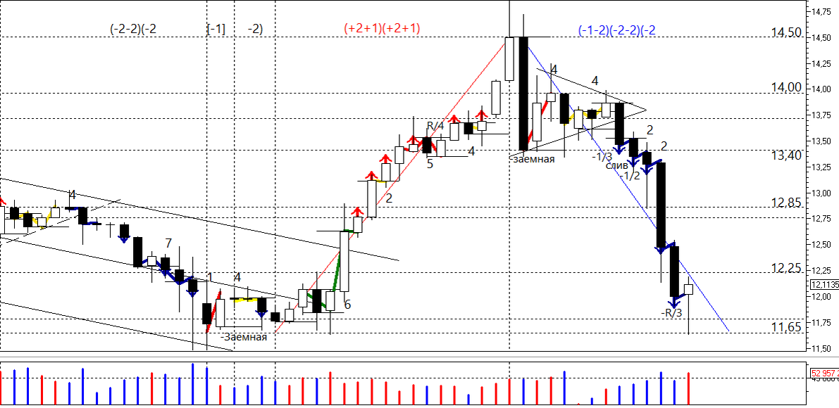 Нетрудно подсчитать, что величина «хода» составляет 60 копеек. Так же, обратите внимание, на диапазон гэпа (окна): 12,50-12,65, который по-прежнему остается открытым. Таким образом, если коррекция действительно продолжится, то окно (gap) может «закрыться».