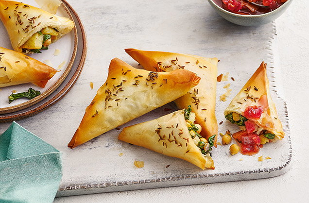 Выпекайте самосы 20-25 минут, пока они не станут золотистыми и хрустящими, перевернув противни на полпути, затем подавайте с чатни. Самосы можно хранить в герметичном контейнере в холодильнике до 3 дней; чатни можно хранить в холодильнике до месяца в герметичной банке.