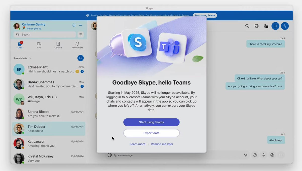 Компания Microsoft на днях официально объявила о прекращении поддержки Skype с 5 мая 2025 года, призывая пользователей перейти на новую платформу Microsoft Teams. Как отмечается, пользователи Skype могут легко перейти на Microsoft Teams, используя свои существующие учетные записи. При входе в Teams с учетной записью Skype все чаты и контакты автоматически перенесутся в новое приложение, позволяя продолжить общение без потери данных. Это также позволяет отказаться от инвестирования ресурсов в несколько сервисов, которые имеют множество одинаковых функций, в том числе поддержку голосовых и видеозвонков, групповых звонков, текстовых сообщений и совместного доступа к файлам. С другой стороны, у Skype есть некоторые возможности, которые отсутствуют в бесплатной версии Teams. Это, к примеру, возможность совершать и получать телефонные звонки прямо с компьютера или мобильного устройства. Подобным может похвастаться разве что Viber. Отметим, что Skype, запущенный в 2003 году и приобретенный Mi
