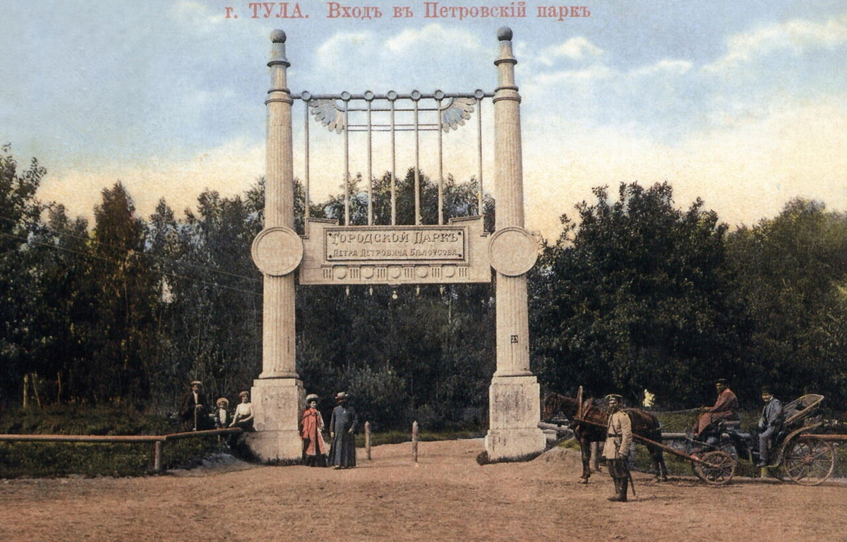 Как театр начинается с вешалки, так и путь в парк начинается с того, что посетители входят в ворота. Главный вход за годы своего существования менял внешний вид и даже местоположение. Первые металлические входные ворота, построенные ещё до революции, видны были издалека. Парк стал излюбленным местом прогулок горожан, а ворота - местной достопримечательностью. Простояли они около 40 лет. В 1930-е годы в стране одно за другим стали возникать строения нового архитектурного стиля. Касалось это не только зданий. Вместо старых ворот появились новые, построенные к 24 мая 1935 года, когда состоялось открытие обновленного Белоусовского парка, получившего и новое имя. Он стал парком имени Отто Юльевича Шмидта. Ворота же были одним из первых представителей нового архитектурного стиля в Туле - сталинского ампира. В октябре 1933 года советский пароход «Челюскин» под командованием капитана В. И. Воронина и начальника экспедиции, члена-корреспондента АН СССР О. Ю. Шмидта, следовавший из Мурманска
