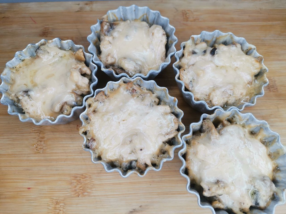 👉 Совет! Если используете лесные грибы, их стоит предварительно отварить. Филе нарезаем кубиками, отправляем к грибам. Всё жарим на большом огне ещё 3-4 минуты, добавляем соль и перец по вкусу. Добавляем сметану – да, именно сметану, а не сливки, как некоторые ошибочно считают. Перемешиваем и тушим ещё 2 минуты. Выкладываем смесь в формочки, посыпаем тёртым сыром. Отправляем в разогретую духовку (180-190°C) на 5-7 минут, пока сыр не расплавится и не подрумянится. ❌ Жульен – это французское блюдо